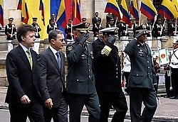 El Ministro de Defensa, Juan Manuel Santos, el presidente Alvaro Uribe, y el Alto Mando Militar. |